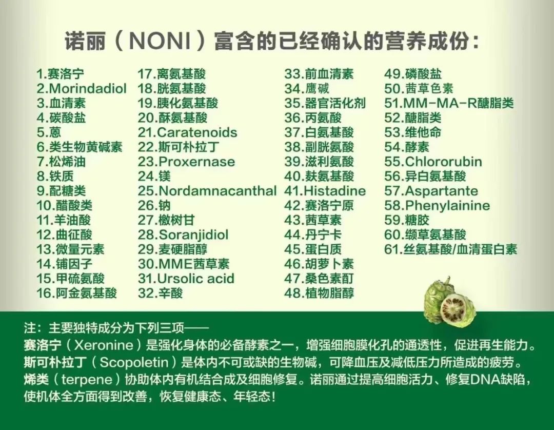 诺丽果(Noni)是Morinda Citrifolia的俗称。几千年前,生活在南太平洋的人民就发现一种遍布该地的小型开花灌木“诺丽树”,其果实具有富含人体细胞体细胞之成份,有强身的效果,从而取用,被誉为植物之后、上帝的恩赐。当地人用诺丽果树保健身体已有两千多年的历史。